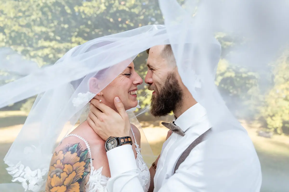 Manchmal fotografiere ich auch durch den Schleier, wodurch sehr weiche, künstlerische Bilder entstehen, die sich deutlich von klassischen Hochzeitsfotos abheben. Hier gestalte ich einen sehr innigen Moment, den meine Brautpaare lieben. Es ist der kurze knisternde Moment kurz vor dem Kuss: ihr riecht einander, spürt einander, habt die Augen geschlossen, lächelt sanft, aber küsst euch noch nicht. Ich liebe einfach diese Bilder. Sie sind jedes Mal ein echter Höhepunkt in den Paarfotos.
